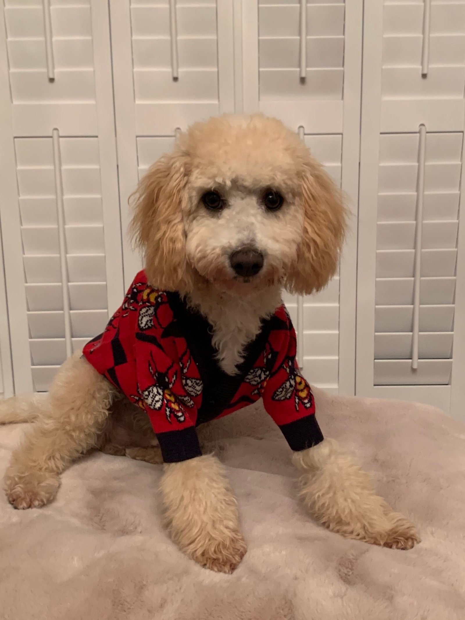 Keep your pooch cosy, warm and stylish in this high fashion soft knitted cardigan with designer inspired bee emblem.