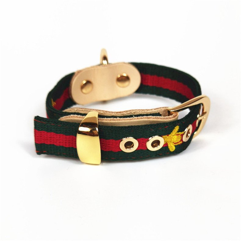 This stylish collar and leash set takes it’s inspiration from vintage Italian design, with its green and red striped material sewn into a leather handle and link connections. Gold metallic accents add additional style to the set.Leash length 1.5m